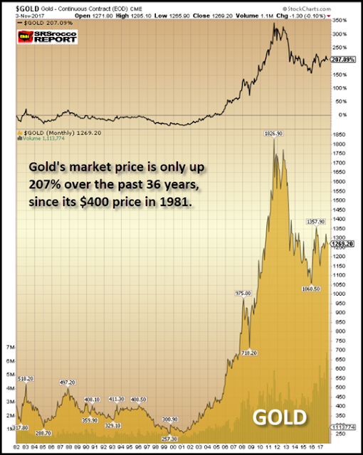 Now, if you think copper under-performed the stock market, wait until you see gold. The gold price today is only up 207% since it was traded for $400 in 1981: