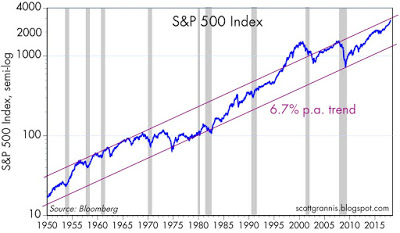 In Chart #1, I've drawn some admittedly arbitrary trend lines on this long-term chart of the S&P 500 index. The trend rate of growth they represent is a bit conservative compared to the 9.4% annualized long-term total return (including dividends) of stocks since 1927, according to Bloomberg. Stocks appear to be pushing the upper limits of growth, according to this chart. But further gains cannot be ruled out. After all, last year's tax reform slashed the corporate income tax rate from 35% to 21%, making future earnings streams suddenly worth 21% more.