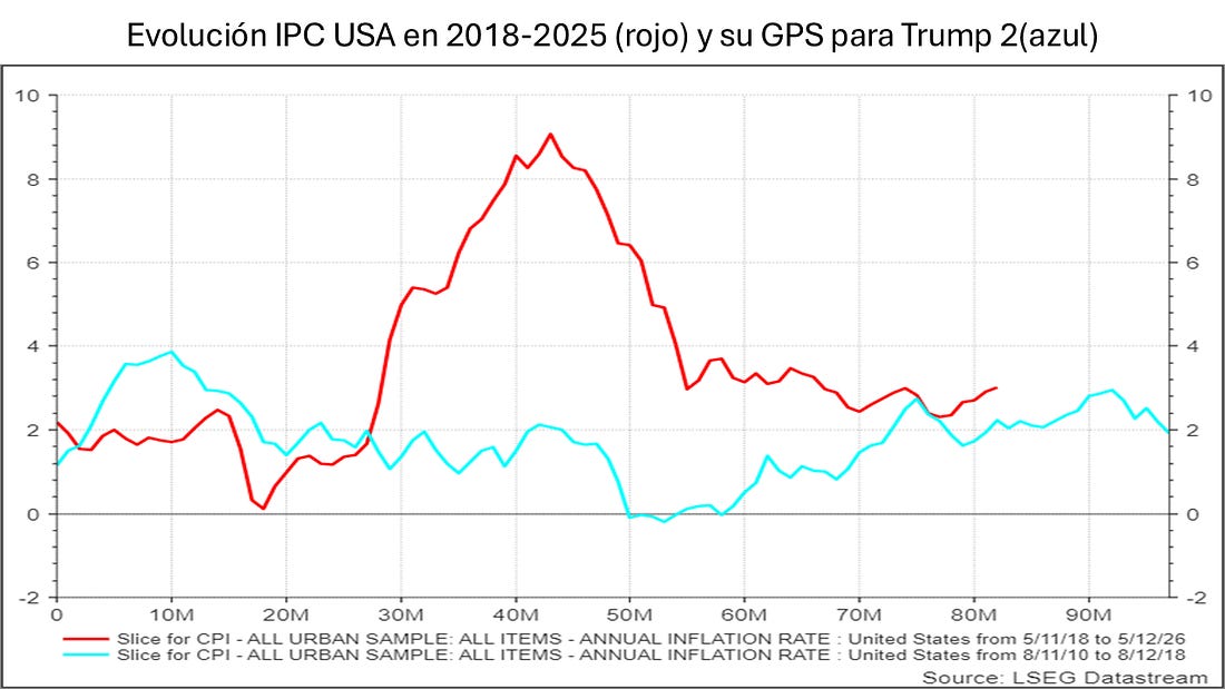Para obtener esa conclusión nos basábamos en el Gráfico 1 de hoy, donde la línea roja representa la evolución del IPC de EEUU en tasa anual desde 2018 hasta ahora y la línea azul celeste su evolución entre 2010 y 2018.