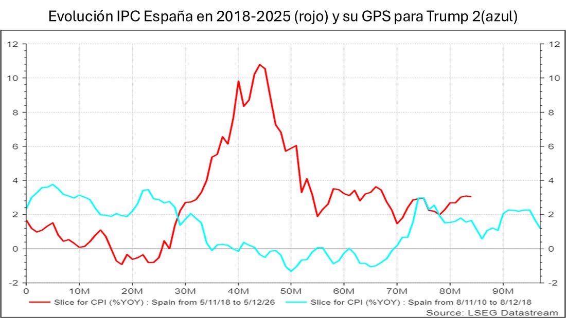 En el caso de España ha venido sucediendo algo parecido hasta el mes de agosto: el IPC anual no superaba el máximo al que llegó en los dos primeros años de Trump 1, que era 2,28%. Sin embargo, a partir del mes de julio ha estado subiendo, hasta situarse, según el último dato, en 3,03%, ligerísimamente inferior al del mes anterior. Se puede ver en el Gráfico 2: